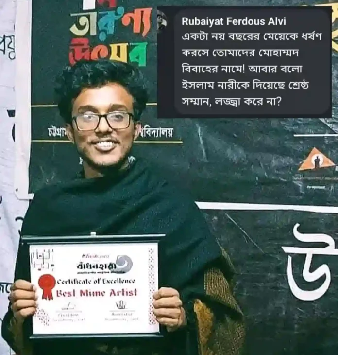বৃহস্পতিবার তার এক ফেসবুক পোস্টে সে রাসুলুল্লাহ সাল্লাল্লাহু আলাইহি ওয়াসাল্লামের সাথে উম্মুল মু’মিনীন হযরত আয়শা রাদিআল্লাহু আনহার বিবাহ নিয়ে কুরুচিকর ভাষায় একটি পোস্ট করে। তার ওই পোস্টের সমালোচনা করায় সে দম্ভভরে হুমকিও প্রদান করে।