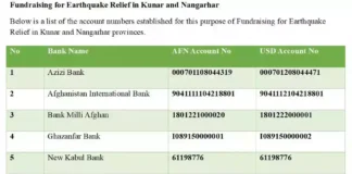 ভূমিকম্পে ক্ষতিগ্রস্তদের সহায়তার জন্য আফগানিস্তানের ব্যাংকসমূহে চালুকৃত হিসাব নম্বরের তালিকা