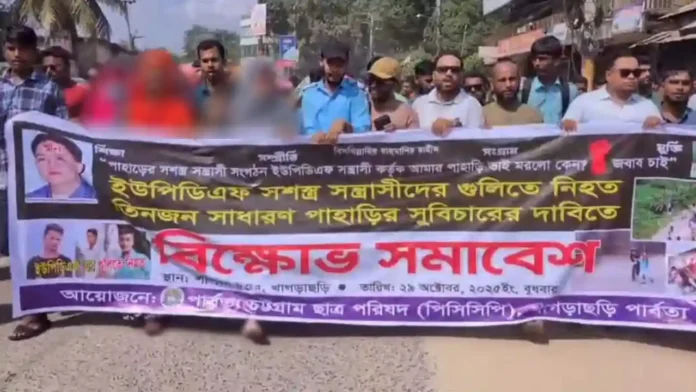 খাগড়াছড়ি সদর ও গুইমারা এলাকায় ইউপিডিএফ-এর হামলায় বসতবাড়ি ও ব্যবসা প্রতিষ্ঠানে অগ্নিসংযোগ ও ভাঙচুর এবং সন্ত্রাসীদের গুলিতে তিনজন সাধারণ পাহাড়ি নিহতের প্রতিবাদে বিক্ষোভ মিছিল ও সমাবেশ করেছে পার্বত্য চট্টগ্রাম ছাত্র পরিষদ (পিসিসিপি) খাগড়াছড়ি জেলা শাখা।