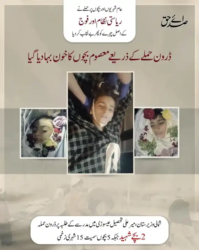 গত ১১ ডিসেম্বর (বৃহস্পতিবার) উত্তর ওয়াজিরিস্তানের মির আলি তহসিলের মাদ্রাসায় জালিম পাকিস্তান সামরিক বাহিনী বেসামরিক নাগরিকদের উপর এক নারকীয় ড্রোন হামলা পরিচালনা করে। উক্ত সন্ত্রাসী হামলায় দুই মাদ্রাসা শিক্ষার্থী শহীদ হন এবং আরো ১৩ বেসামরিক নাগরিক আহত হয়েছেন।