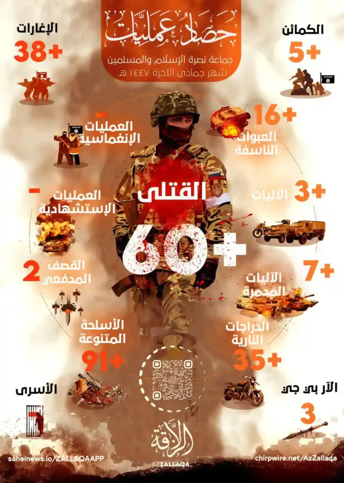 জেএনআইএম এর সাথে যুক্ত আয-যাল্লাকা মিডিয়া কর্তৃক প্রকাশিত একটি ইনফোগ্রাফি রিপোর্টে উল্লেখ করা হয়েছে যে, মুজাহিদিনরা গত জমাদিউস সানি (ডিসেম্বর) মাসে মালি, বুরকিনা ফাসো, নাইজার এবং বেনিনে অন্তত ৫৯টি পৃথক অপারেশন পরিচালনা করেছেন। মুজাহিদদের এসকল অপারেশনের মধ্যে রয়েছে ৩৮টিরও বেশি সম্মুখ যুদ্ধ, ১৬টির অধিক আইইডি বিস্ফোরণ, ৫টি অ্যাম্বুশ এবং ২টি ক্ষেপণাস্ত্র হামলা।