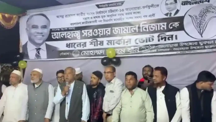 চট্টগ্রাম-১৩ (আনোয়ারা–কর্ণফুলী) আসনে বিএনপির প্রার্থী সরওয়ার জামাল নিজাম আগামী ১২ তারিখ পর্যন্ত নিজ নেতাকর্মীদের চাঁদাবাজি না করার জন্য দুই হাত জোড় করে অনুরোধ জানিয়েছে। গত শুক্রবার (৬ ফেব্রুয়ারি) রাত ৯টার দিকে আনোয়ারা উপজেলার চাতুরী চৌমুহনী বাজারে তার নির্বাচনি কার্যালয় উদ্বোধনকালে দেওয়া এক বক্তব্যে সে এই অনুরোধ করে।