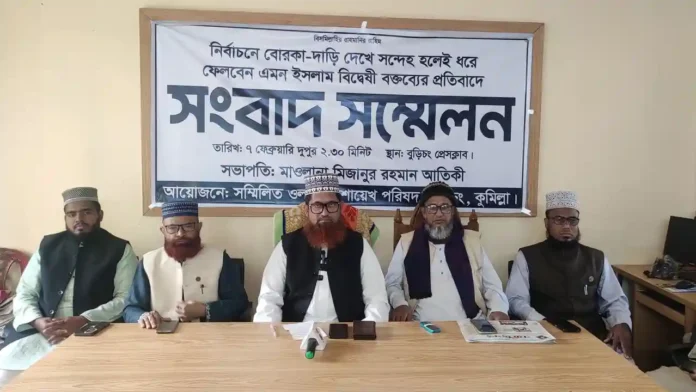 স্থানীয় বিএনপি নেতা দাড়ি ও বোরকা পরিহিত ব্যক্তিদের দেখলেই ধরে ফেলার বিতর্কিত বক্তব্যের প্রতিবাদে কুমিল্লা উত্তর জেলা সম্মিলিত ওলামা-মাশায়েখ পরিষদ সংবাদ সম্মেলন করেছেন। গণমাধ্যমের বরাতে জানা যায়, গত শনিবার (৭ ফেব্রুয়ারি) বিকেলে কুমিল্লার বুড়িচং প্রেস ক্লাবে আয়োজিত এক সংবাদ সম্মেলনে লিখিত বক্তব্যে দেন সম্মিলিত ওলামা-মাশায়েখ পরিষদের সভাপতি মাওলানা মিজানুর রহমান আতিকী।