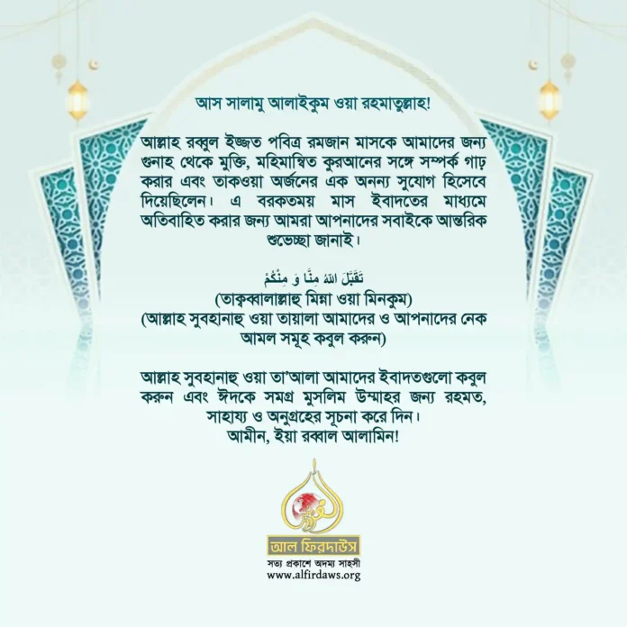 আল্লাহ সুবহানাহু ওয়া তা’আলা আমাদের ইবাদতগুলো কবুল করুন এবং ঈদকে সমগ্র মুসলিম উম্মাহর জন্য রহমত, সাহায্য ও অনুগ্রহের সূচনা করে দিন।