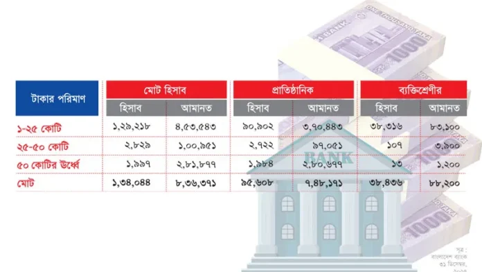কেন্দ্রীয় ব্যাংকের দেয়া ব্যক্তিশ্রেণীর আমানতকারীদের তথ্য পর্যালোচনা করে দেখা যায়, গত ডিসেম্বরে ব্যাংকগুলোতে ১ কোটি টাকার বেশি জমা আছে এমন হিসাব সংখ্যা ছিল ৩৮ হাজার ৪৩৬। এর মধ্যে ২৫ থেকে ৫০ কোটি টাকার আমানত থাকা হিসাব সংখ্যা ছিল মাত্র ১০৭। এ হিসাবগুলোতে জমা থাকা আমানতের স্থিতি ছিল ৩ হাজার ৯০০ কোটি টাকা। ২০২৪ সালের ডিসেম্বর শেষে এ ধরনের ১৪১টি ব্যাংক হিসাবে ৪ হাজার ৯০০ কোটি টাকা জমা ছিল। একই সময়ে ৫০ কোটি টাকার বেশি এমন ব্যাংক হিসাব ছিল ৪৪টি, যাতে জমা ছিল ৫ হাজার ৪০০ কোটি টাকার আমানত। ২০২৫ সালের ডিসেম্বরে এ ধরনের হিসাব সংখ্যা মাত্র ১৩-এ নেমে আসে। আর হিসাবগুলোতে আমানতের স্থিতি নেমে যায় ১ হাজার ২০০ কোটি টাকায়।