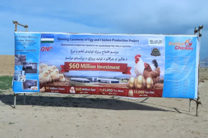 আফগানিস্তানের বালখ প্রদেশের রাজধানী মাজার-ই-শরীফে আফগান ও উজবেক ব্যবসায়ীদের যৌথ বিনিয়োগে ৬০ মিলিয়ন ডলার ব্যয়ে একটি বৃহৎ পোল্ট্রি উৎপাদন প্রকল্পের নির্মাণ কাজ শুরু হয়েছে। সংশ্লিষ্ট সূত্র জানায়, এই প্রকল্পের মাধ্যমে দেশের পোল্ট্রি খাতে নতুন সম্ভাবনার দ্বার উন্মোচিত হতে যাচ্ছে।