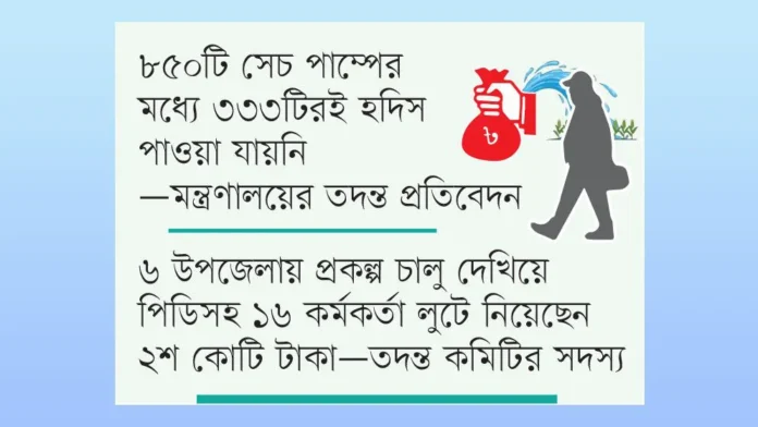 তদন্ত কমিটির একজন সদস্য নাম প্রকাশ না করার শর্তে যুগান্তরকে জানায়, নিম্নমানের সরঞ্জামাদি দিয়ে কোনোরকমে কিছু সেচ পাম্প চালু করা হয়। এছাড়া ৩৩৩টি সেচ পাম্পের অনুকূলে বরাদ্দ থেকে ঠিকাদারদের মাধ্যমে প্রকল্প পরিচালক রাফিউস সাজ্জাদসহ ১৬ কর্মকর্তা অন্তত ২০০ কোটি টাকা লোপাট করেছে। পর্যায়ক্রমে এই টাকা এডিবিকে সুদে-আসলে পরিশোধ করতে হবে।