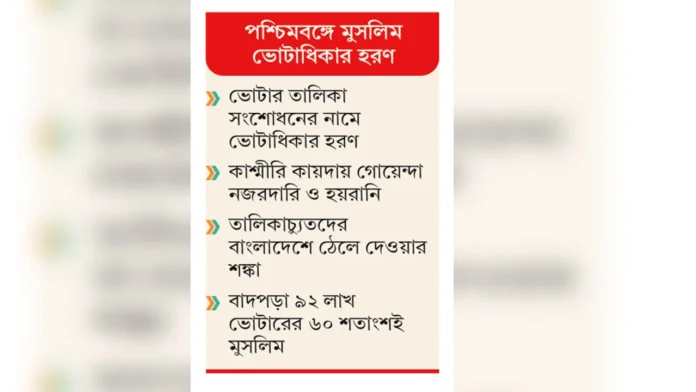 ভারতের পশ্চিমবঙ্গে মুসলিম নাগরিকদের ভোটাধিকার তালিকা থেকে বাদ দেওয়ার ঘটনা উক্ত অঞ্চলে মুসলিমদের ভবিষ্যত নিয়ে তীব্র শঙ্কা তৈরি করেছে। ভারতের অবৈধ অধিকৃত কাশ্মীরের মতো পশ্চিমবঙ্গেও বাড়ছে গোয়েন্দা নজরদারি ও হয়রানি। তালিকাচ্যুতদের বাংলাদেশের দিকে ঠেলে দেওয়ার আশঙ্কা জোরালো হচ্ছে। ১৭ এপ্রিল ‘দৈনিক আমার দেশ’ পত্রিকায় বাংলাদেশের সীমান্তে “আরেক কাশ্মীর হওয়ার পদধ্বনি” শিরোনামে এই সংক্রান্ত একটি প্রতিবেদন তুলে ধরা হয়েছে।