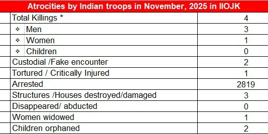 নভেম্বর মাসে দখলদার ভারতীয় বাহিনীর হাতে এক নারীসহ ৪ কাশ্মীরি মুসলিম শহীদ, গ্রেফতার ২৮১৯ জন