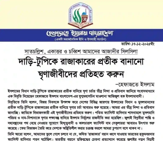দাড়ি-টুপিকে রাজাকারের প্রতীক বানানো ঘৃণাজীবীদের প্রতিহত করুন: হেফাজতে ইসলাম