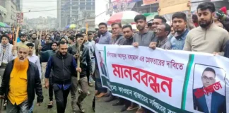 কারওয়ান বাজারে বিএনপির চাঁদাবাজির বিরুদ্ধে ব্যবসায়ীদের শান্তিপূর্ণ মানববন্ধনে হামলা