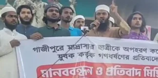 গাজীপুরে হিন্দুত্ববাদী চক্র কর্তৃক মাদ্রাসাছাত্রী গণধর্ষণের প্রতিবাদে খেলাফত ছাত্র মজলিসের মানববন্ধন